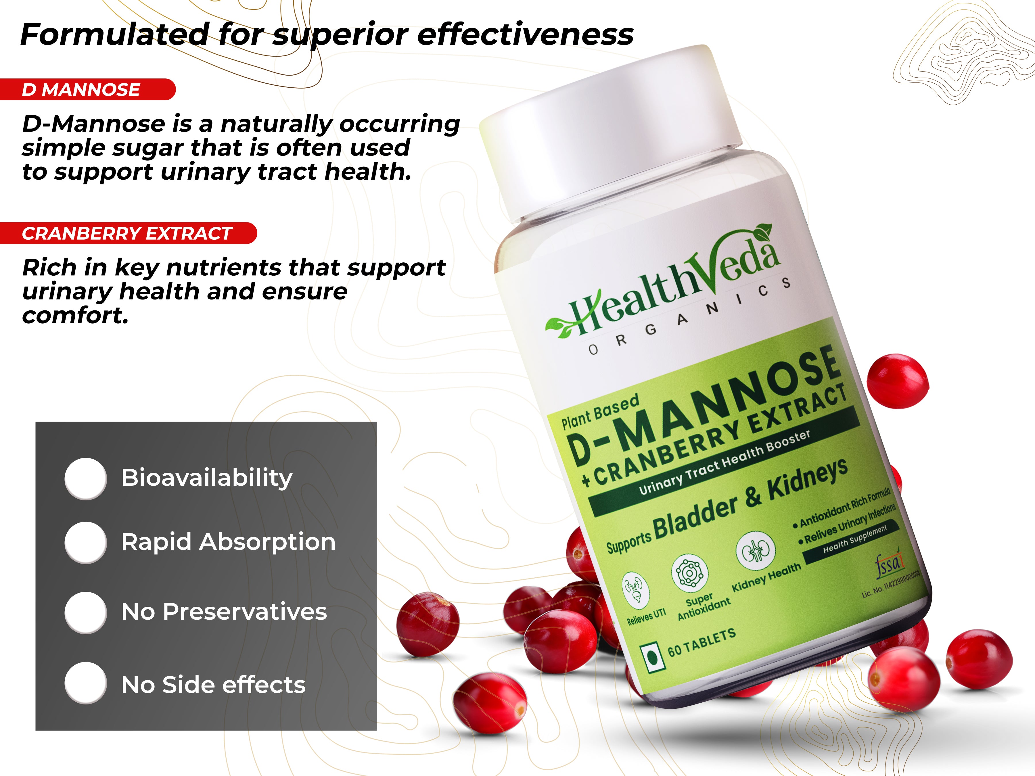 - IMPROVE URINARY TRACT HEALTH: Health Veda Organics D-MANNOSE + CRANBERRY EXTRACT Tablets loaded with Antioxidants and Antimicrobial properties for optimal urinary tract health.