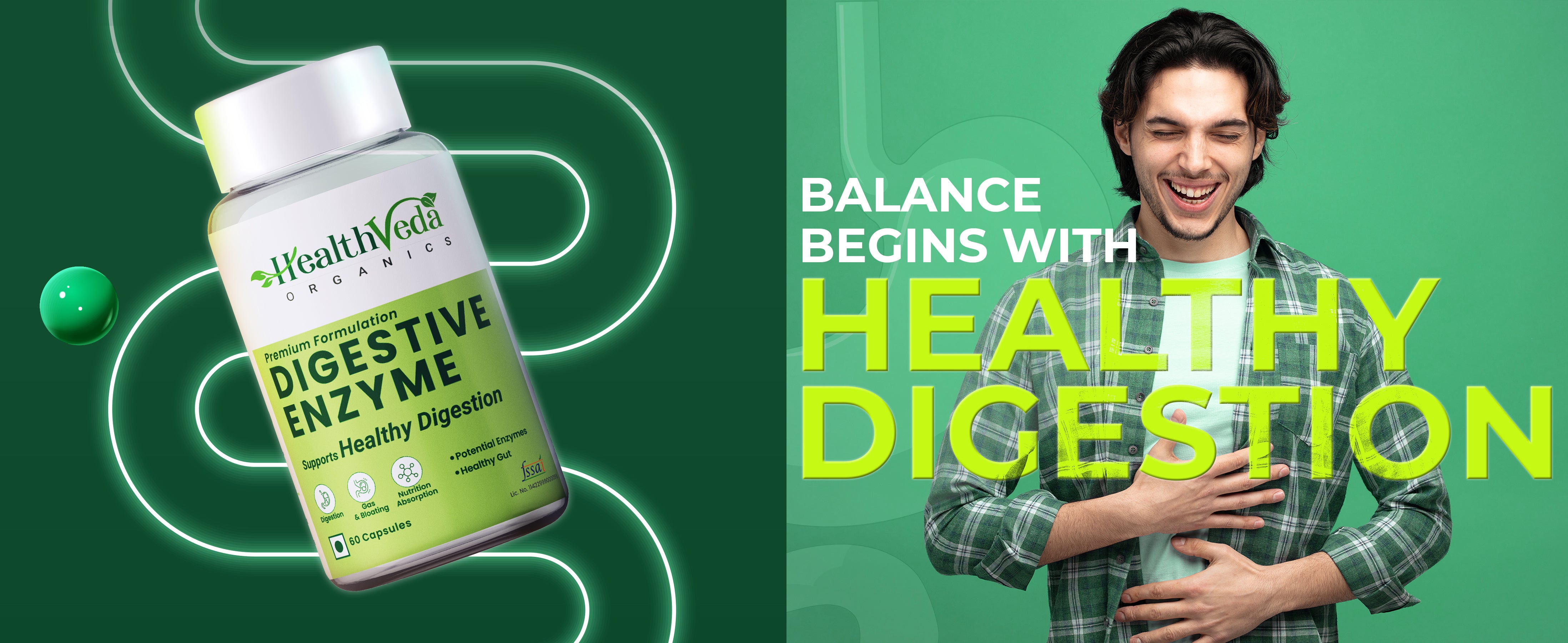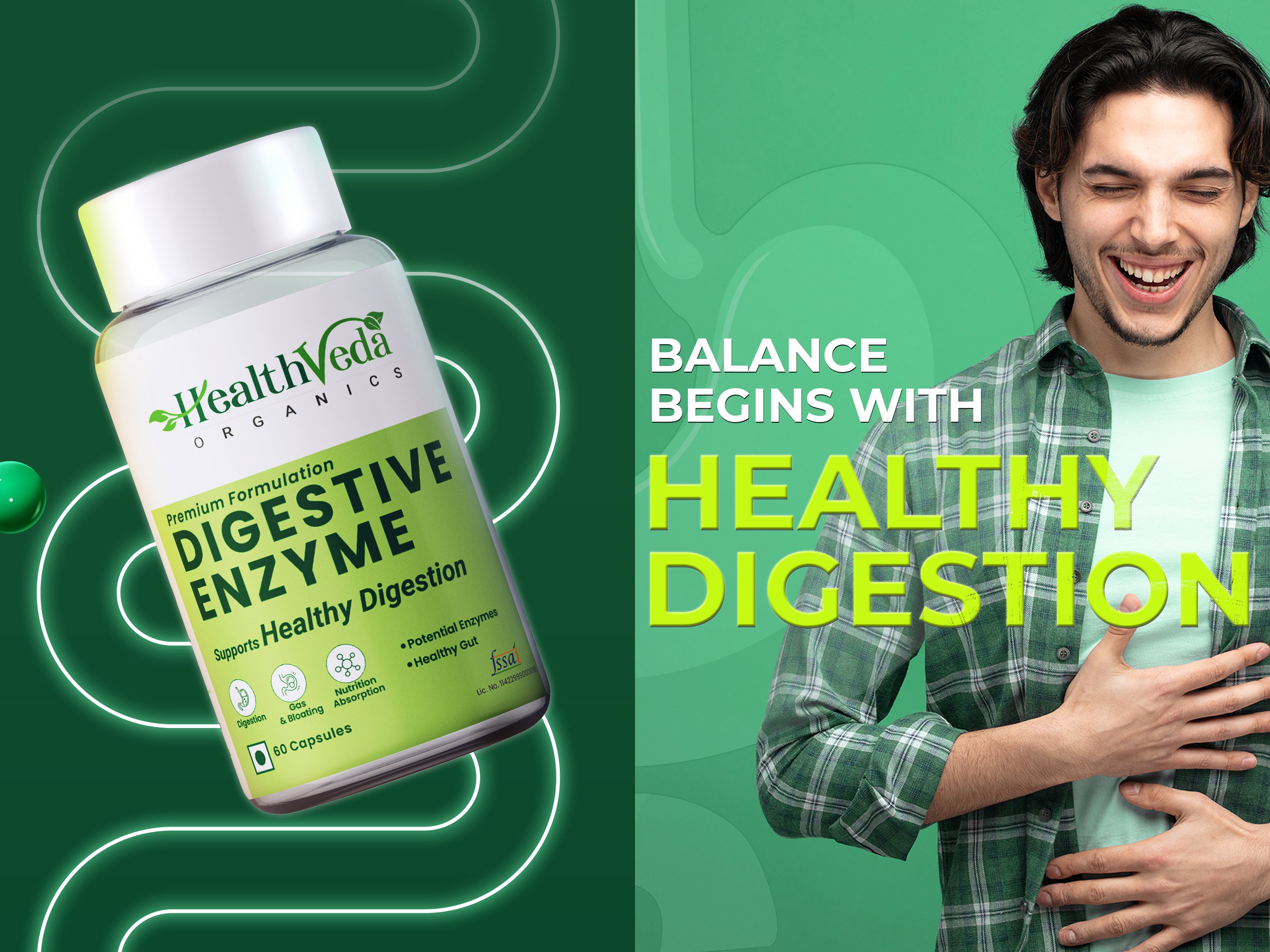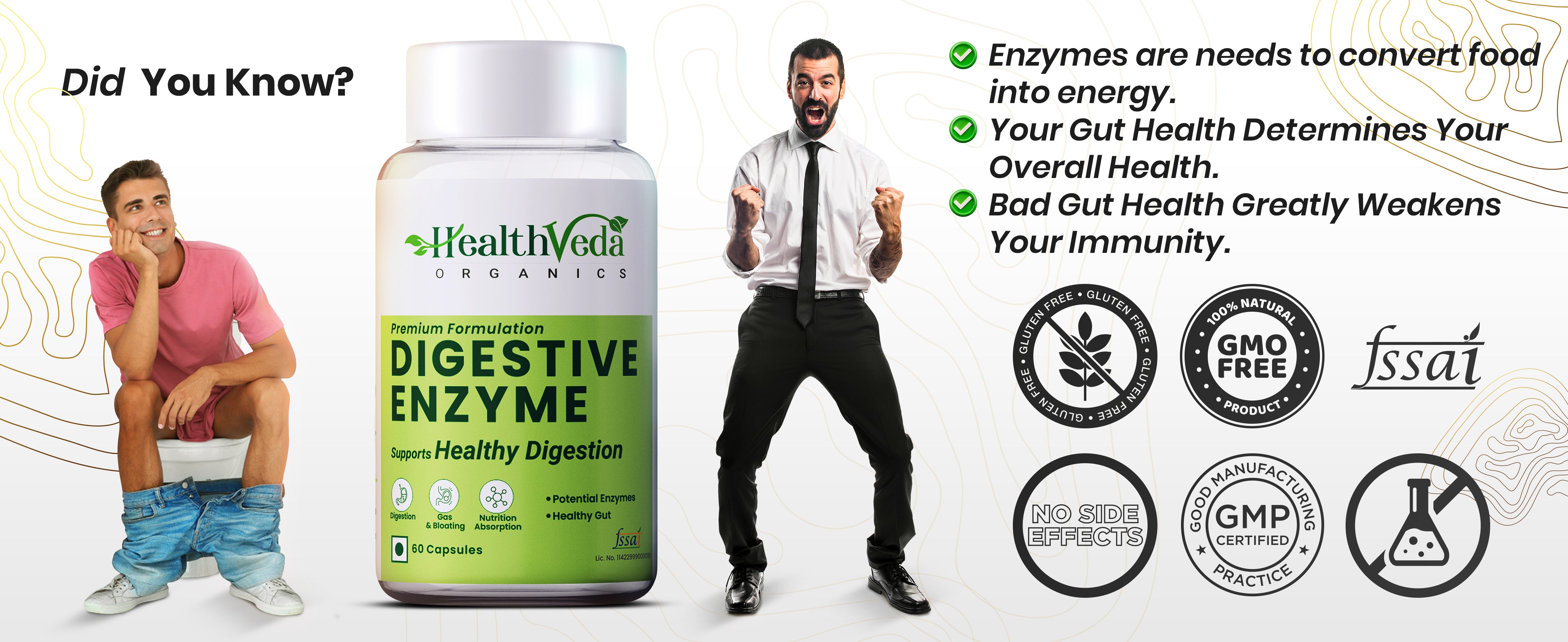 - POTENTIAL ENZYMES: Each Health Veda Organics Digestive Enzyme capsule is uniquely formulated with highly potent 12 digestive enzymes that aid in digestive metabolism. Each capsule provides the body with enzymes that help digest fats, proteins & carbohydrates. It also relieves digestive discomfort. It has various digestive enzymes that work well at various PH levels.