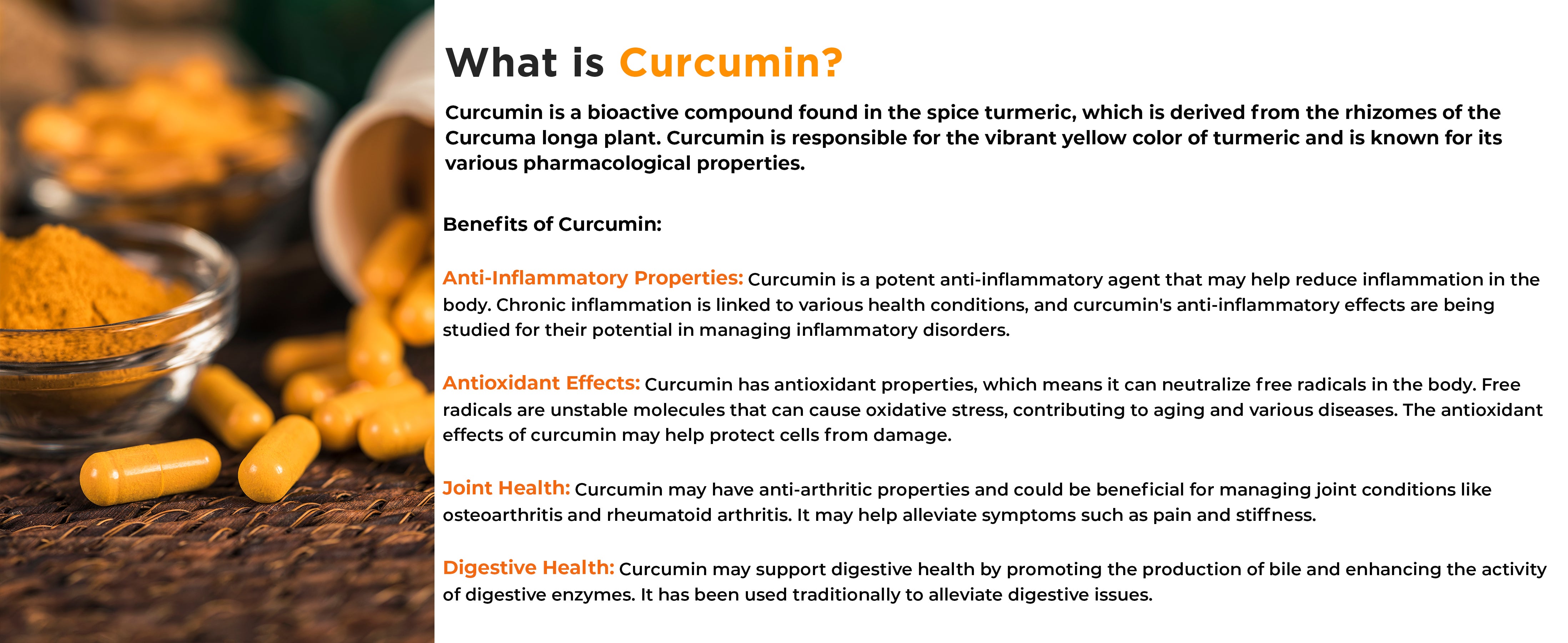 RICH IN ANTIOXIDANTS: Curcumin is an age-old powerful anti-inflammatory ingredient used in relieving joint pain, inflammation, swelling, soreness & redness. Curcumin controls inflammation in the body by inhibiting key inflammatory agents in the body.