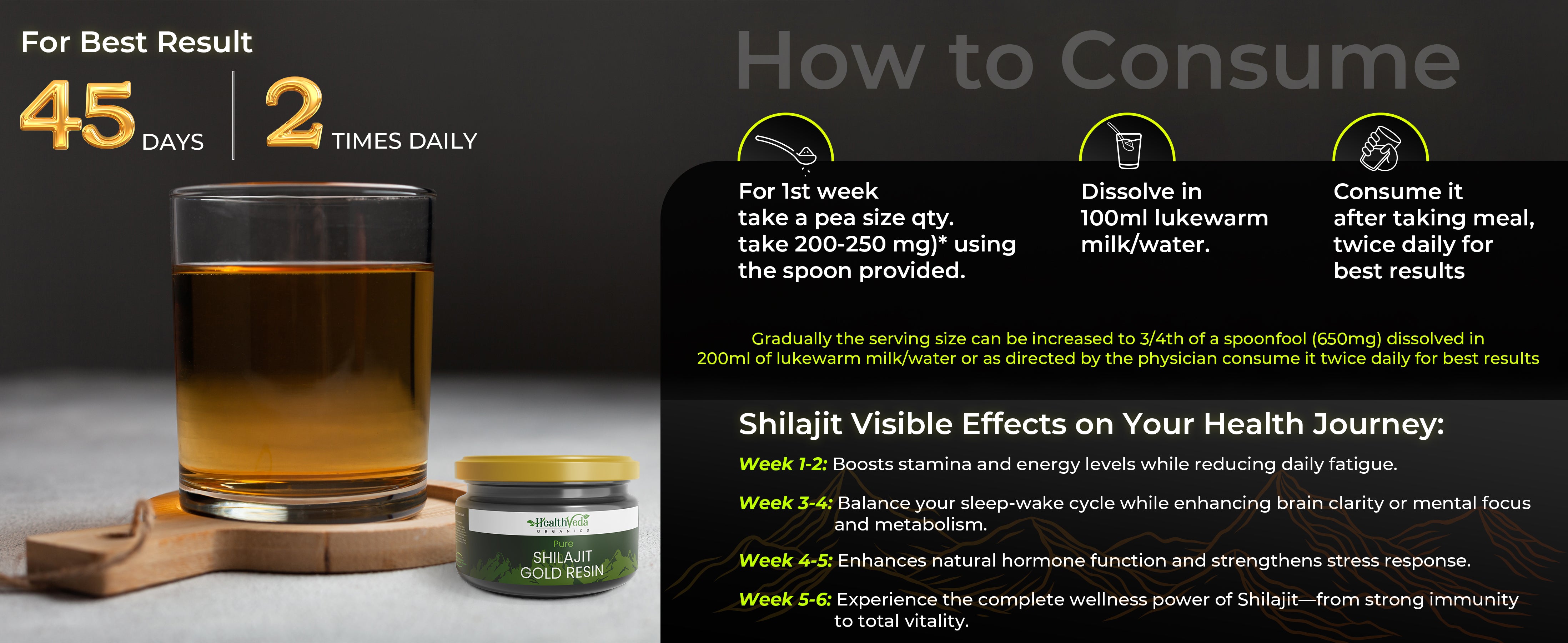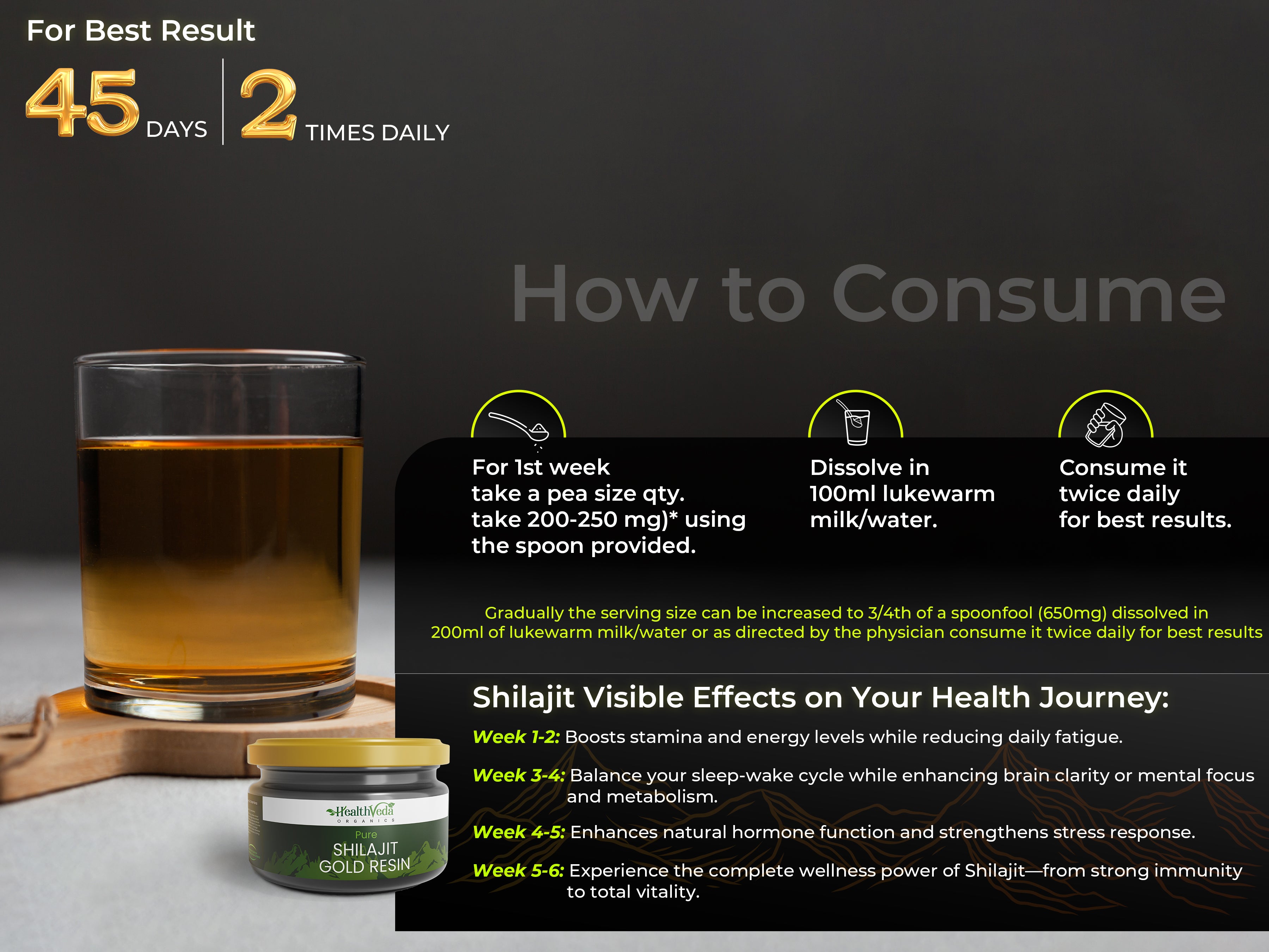 STEPS TO CONSUME: STEP 1: Take 500 mg (1/2 spoon) of Shilajit Resin once a day if you do a light workout and twice a day if you do an intense workout. STEP 2: Mix well with 100 ml lukewarm water or milk. STEP 3: Drink recommended to be consumed as a pre-workout/after taking meals for at least 2 months for the noticeable results.