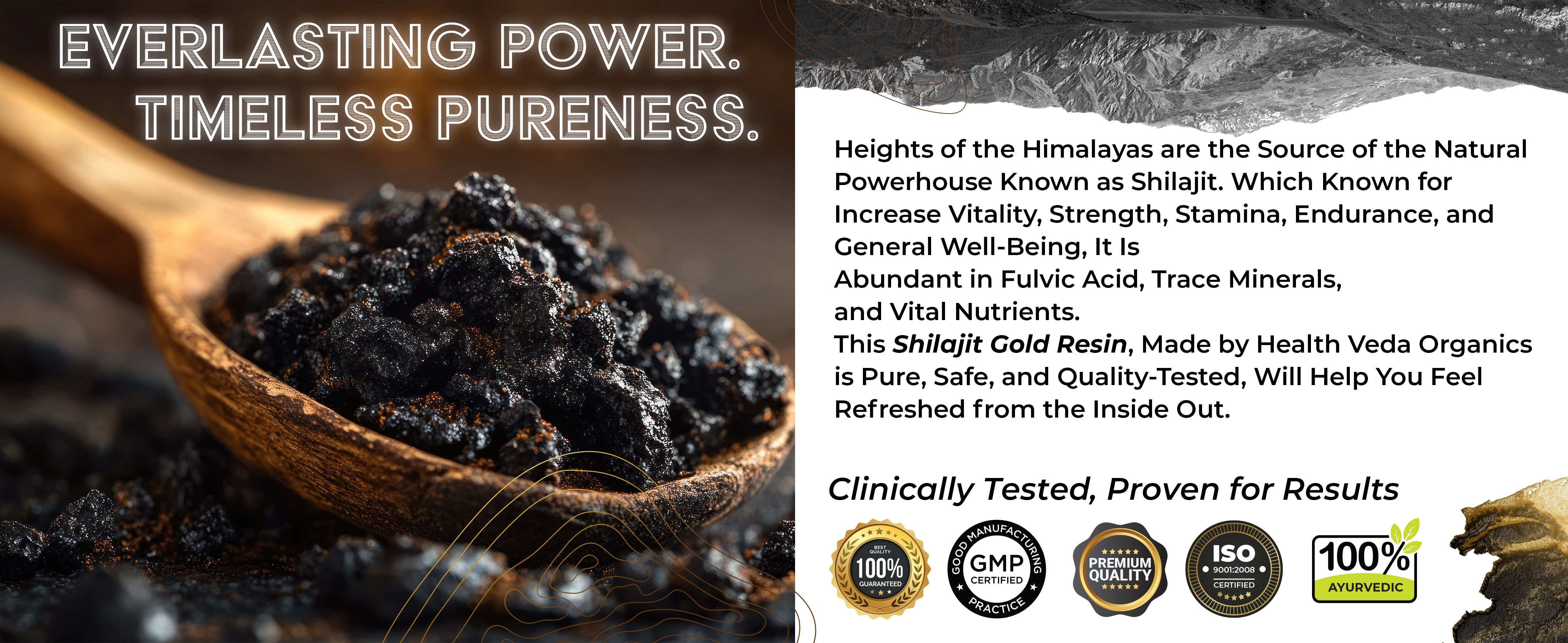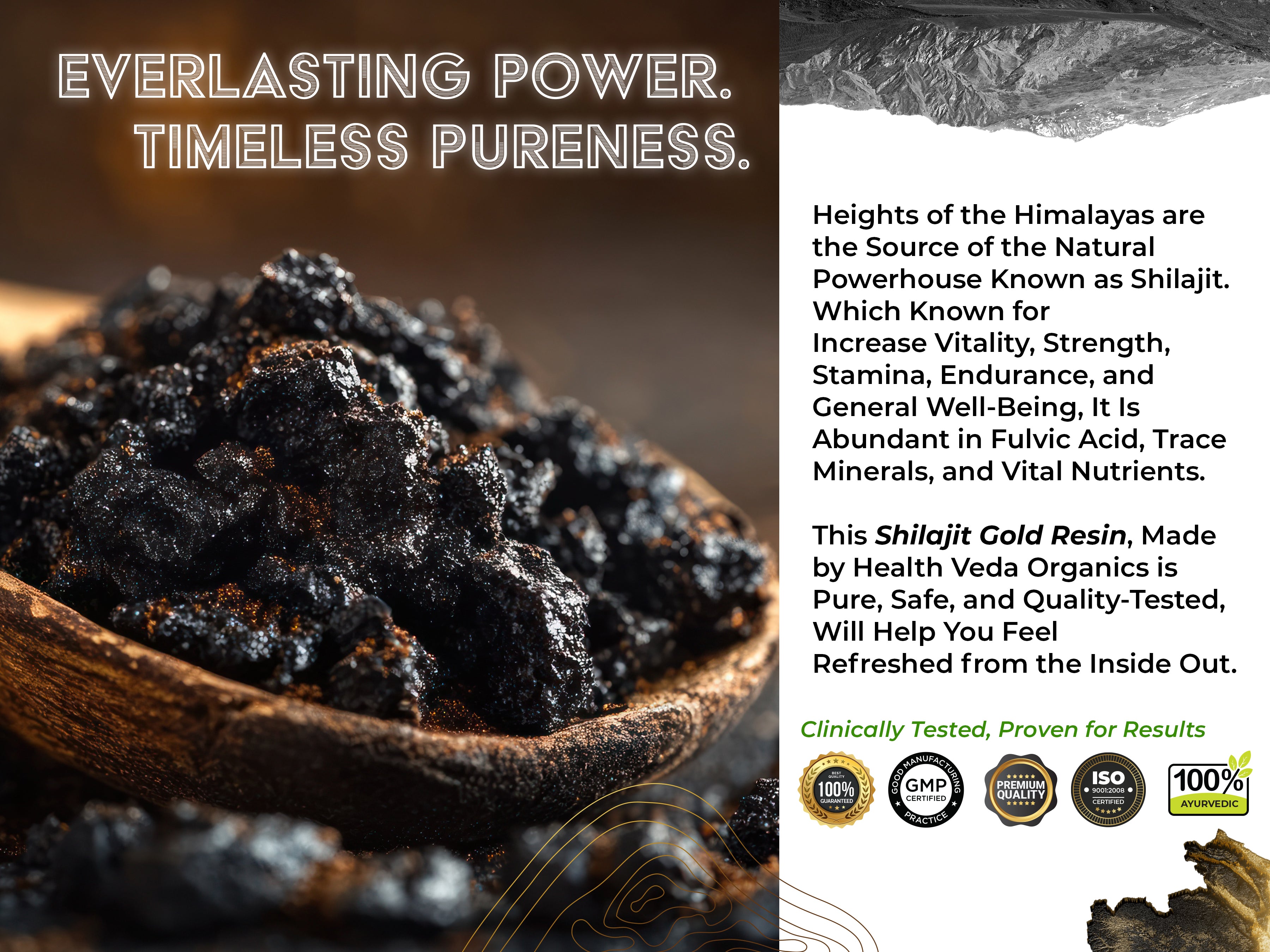 Health Veda Organics Himalayan Shilajit Gold Resin is a pure natural supplement sourced from the high altitudes of the Himalayas. Known for its rich mineral content and holistic benefits. Our Gold resin is meticulously purified to ensure potency and effectiveness, providing a powerful boost to your overall health and wellness. This powerful resin is renowned for its ability to enhance energy levels, support immune function, and aid in detoxification. With its high concentration of fulvic acid, Shilajit helps transport essential nutrients into the cells, optimizing their absorption and utilization.