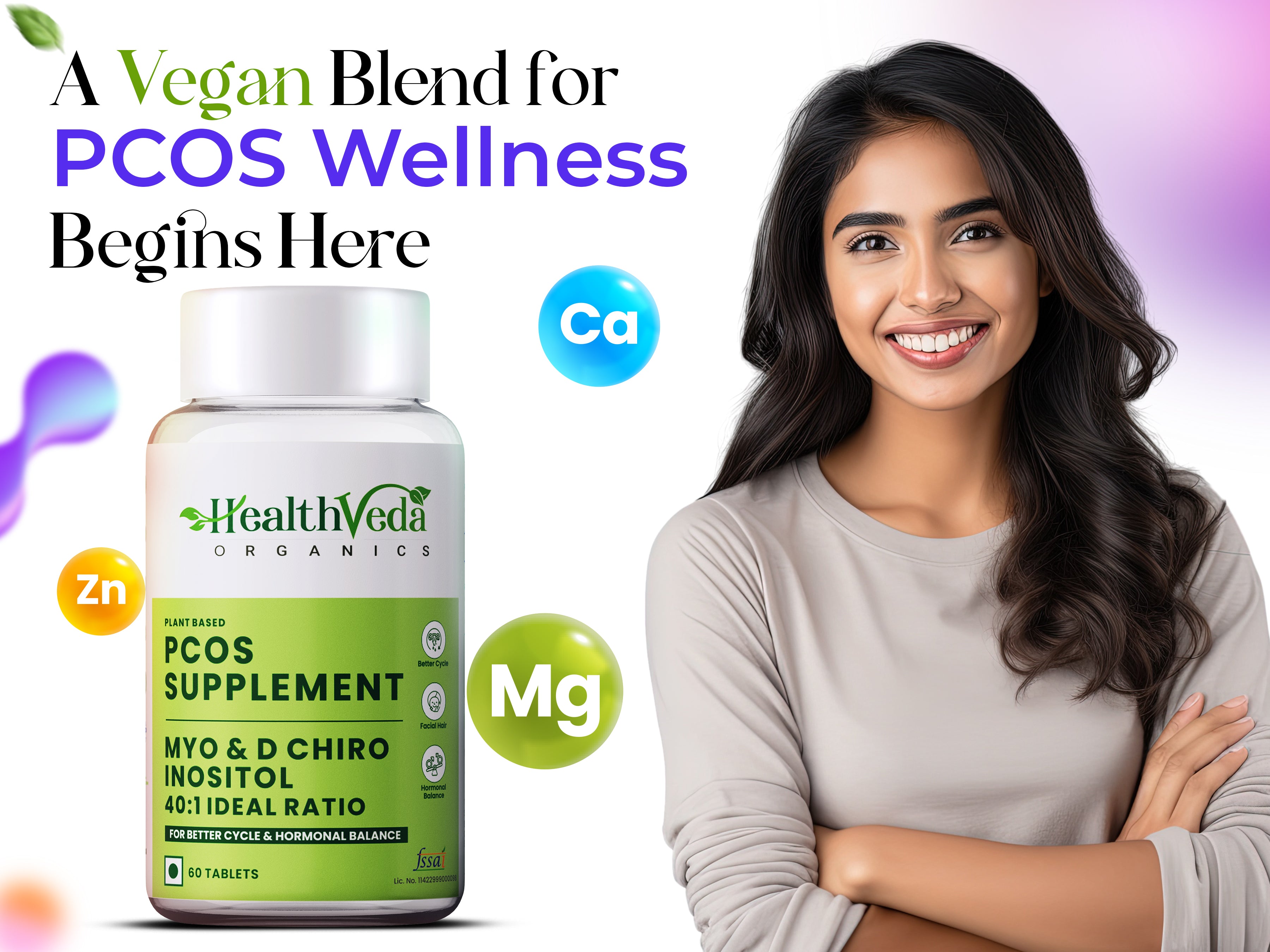 HEALTH VEDA ORGANICS PRIVATE LIMITED Plant Based PCOS With Myo-Inositol 2000Mg, D-Chiro-Inositol 50Mg|60 Veg Tablets|Healthy Regular Menstruation|For Women