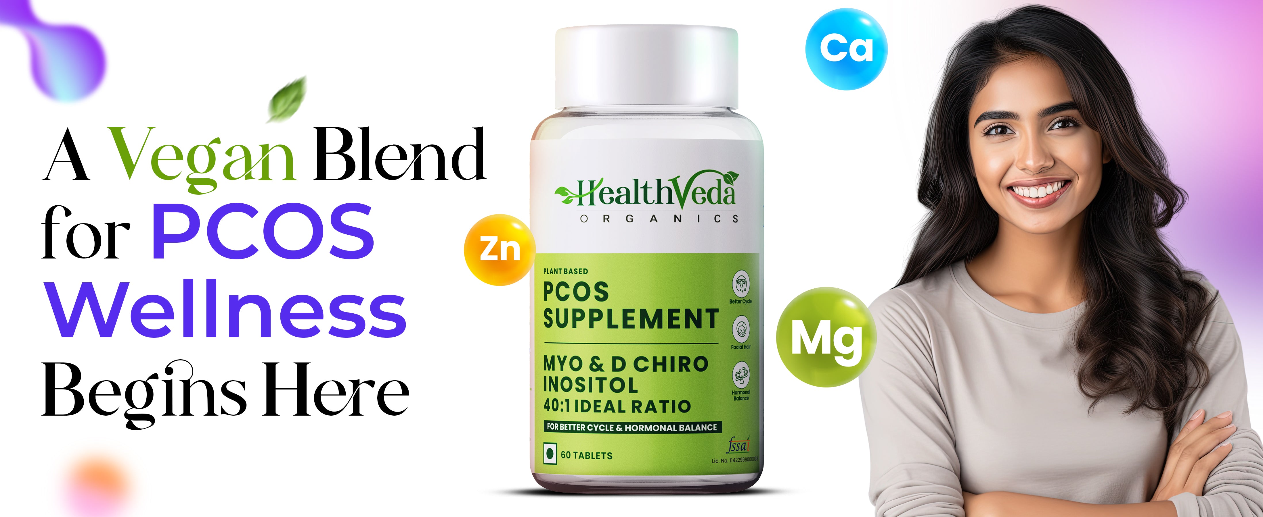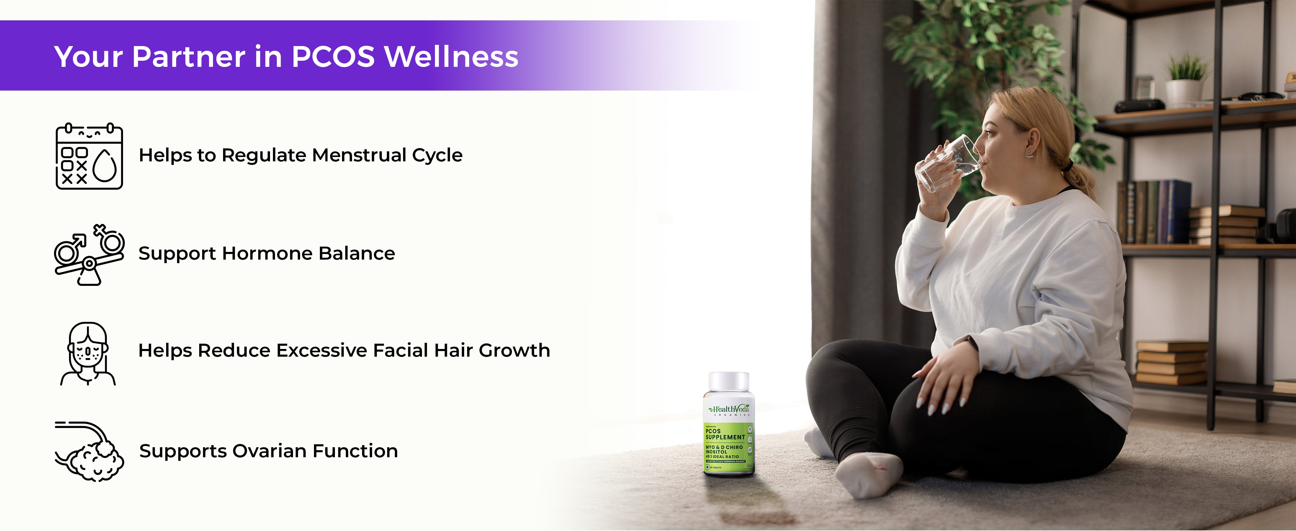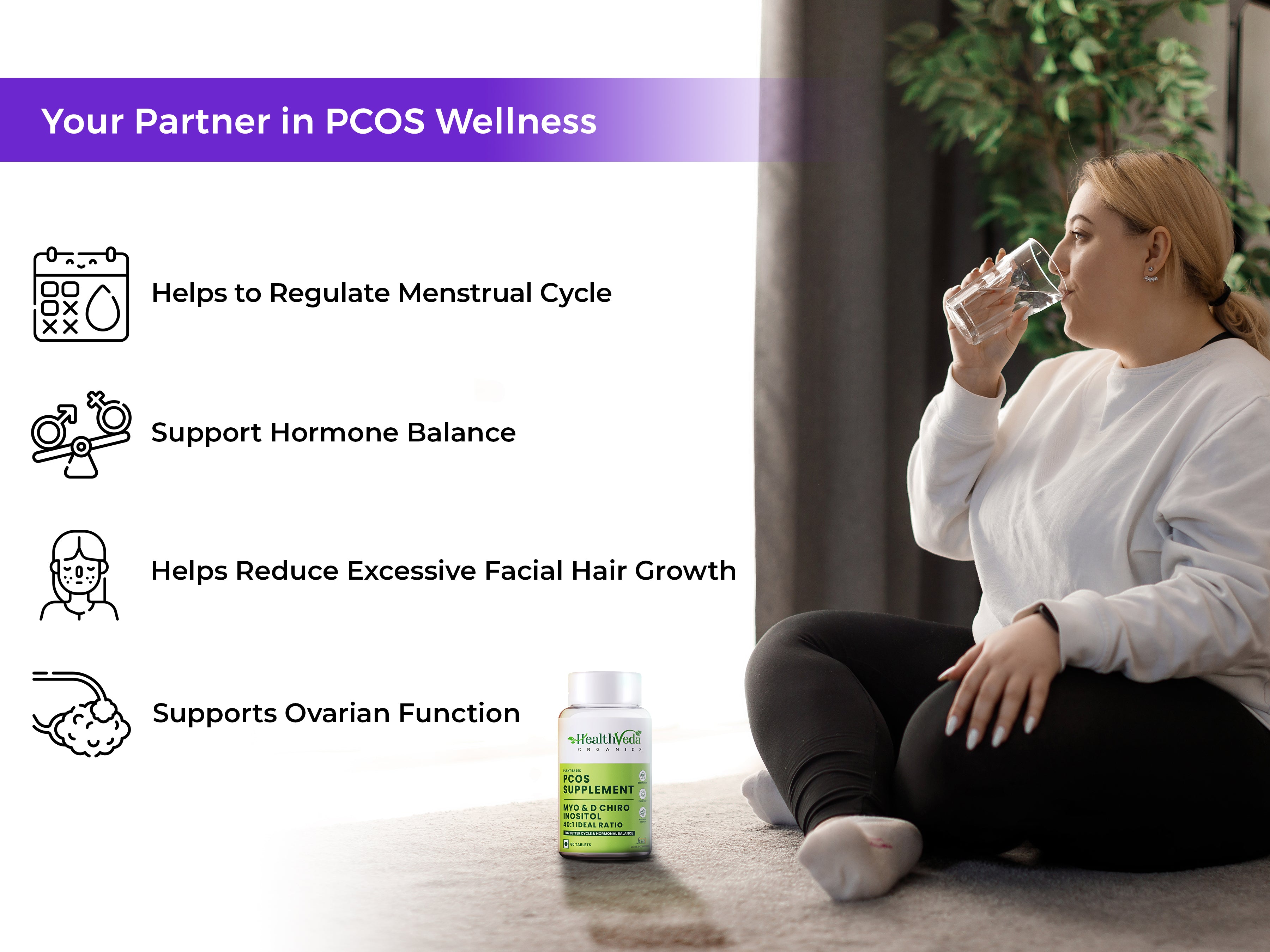 - REDUCES ACNE & FACIAL HAIR: HealthVeda Organics PCOS Tablets help reduce various PCOS symptoms like acne, facial hair & loss of hair. The main reason for PCOS symptoms is hormonal imbalance, leading to mood swings. These supplements help to regulate hormonal balance in the body and reduce stress & irritation, leading to a Happy Mood.