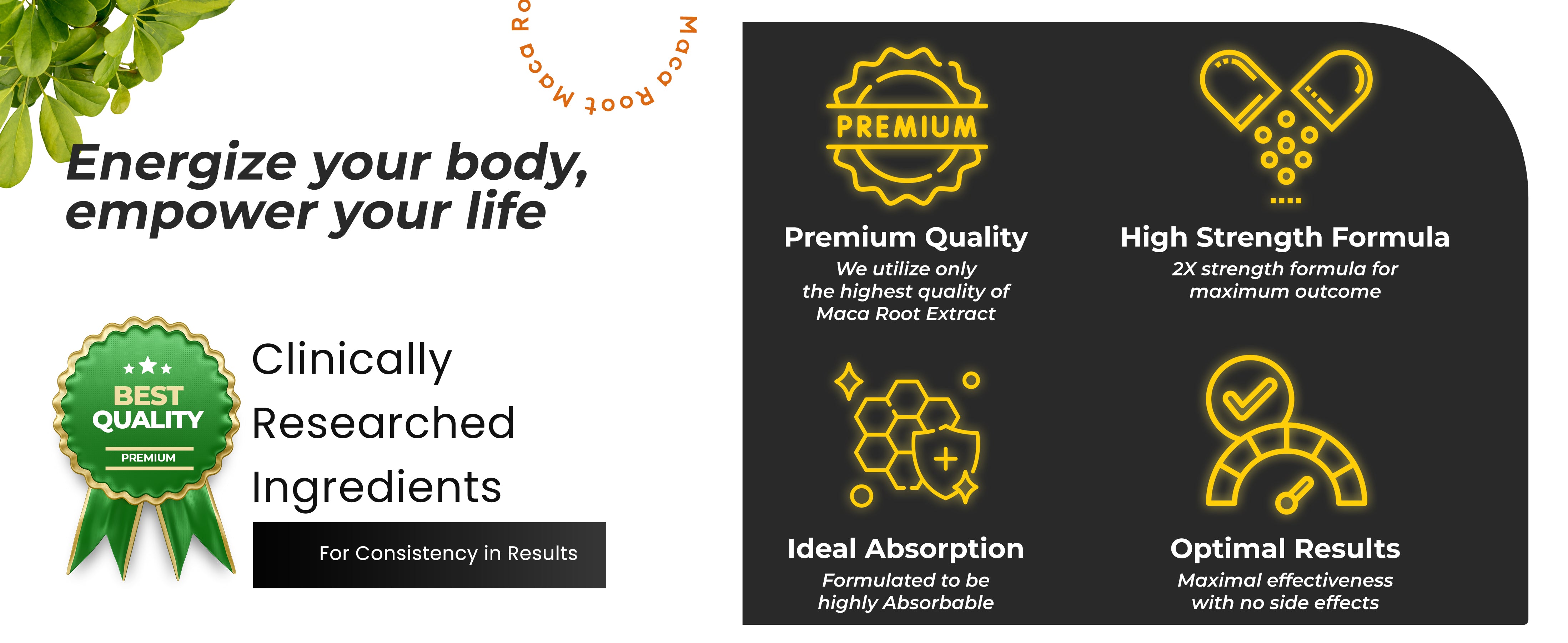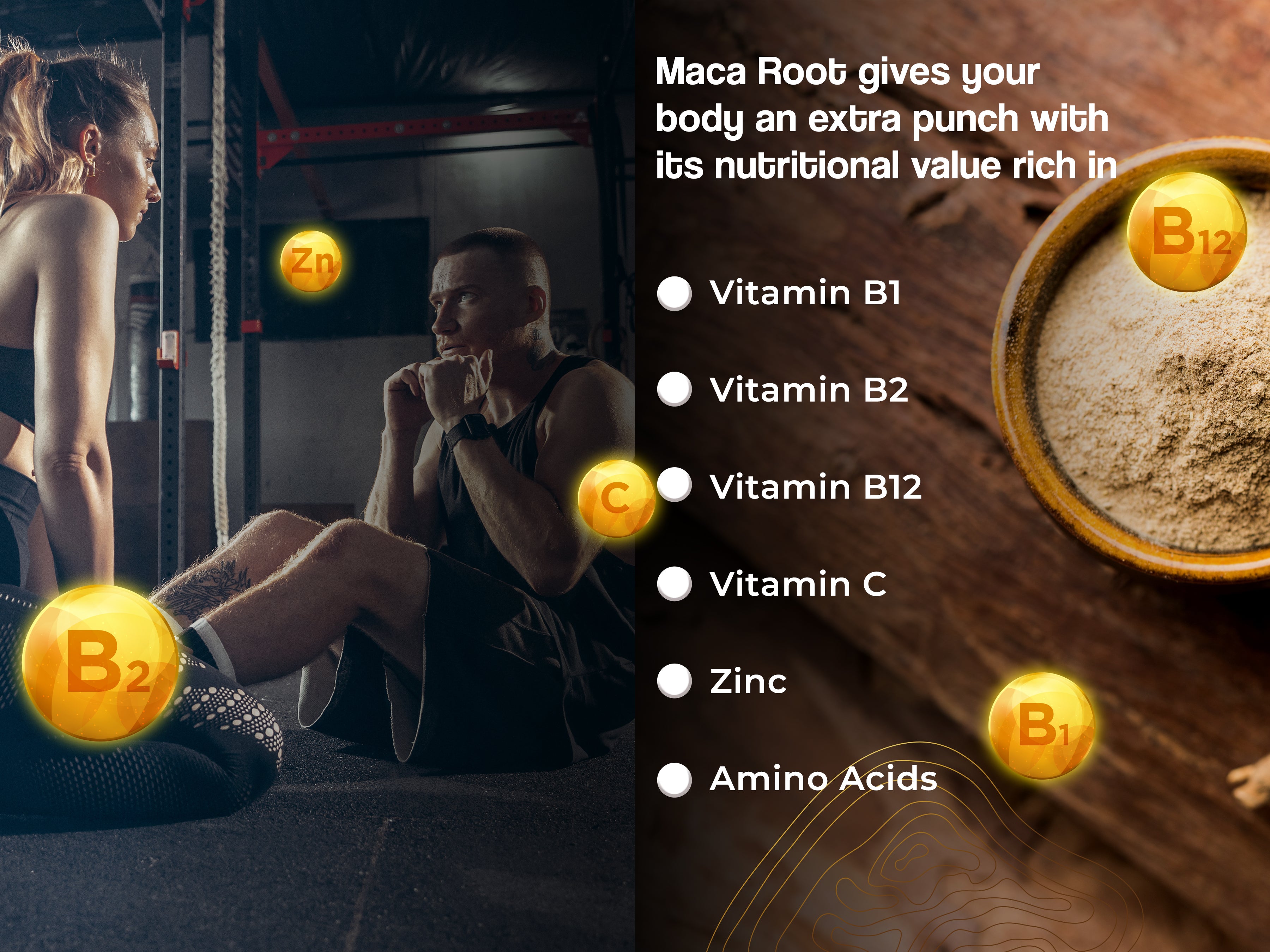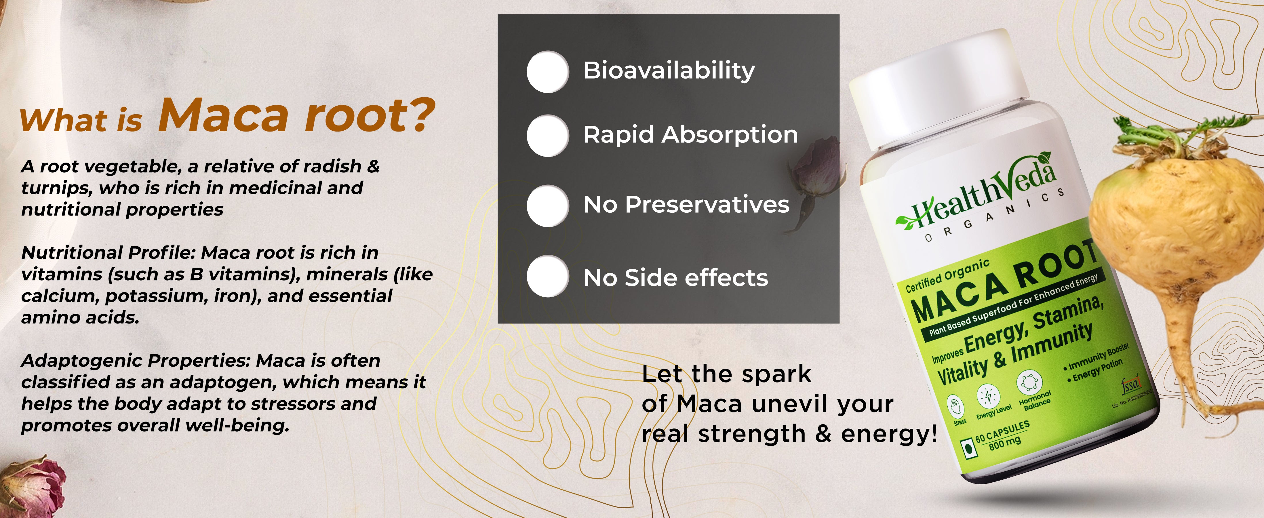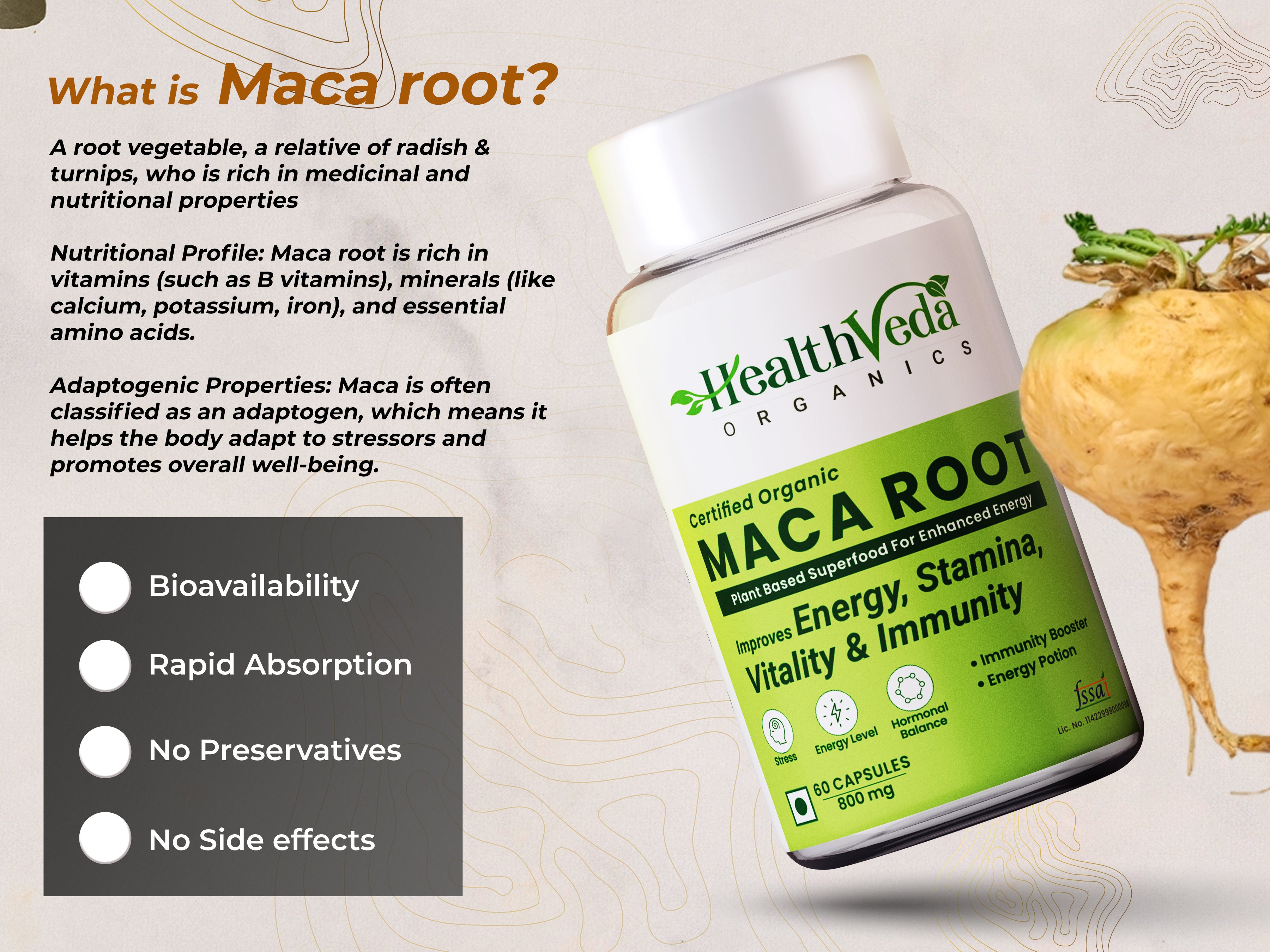 Maca Root Capsules boost reproductive health. Maca Root not only helps relax your nervous system and reduce stress, but it also gives you a boost of natural energy and strength, enhances endurance, immunity & many more benefits. Boosts energy levels, promotes muscle health, enhances mood, and regulates blood pressure for an active lifestyle.