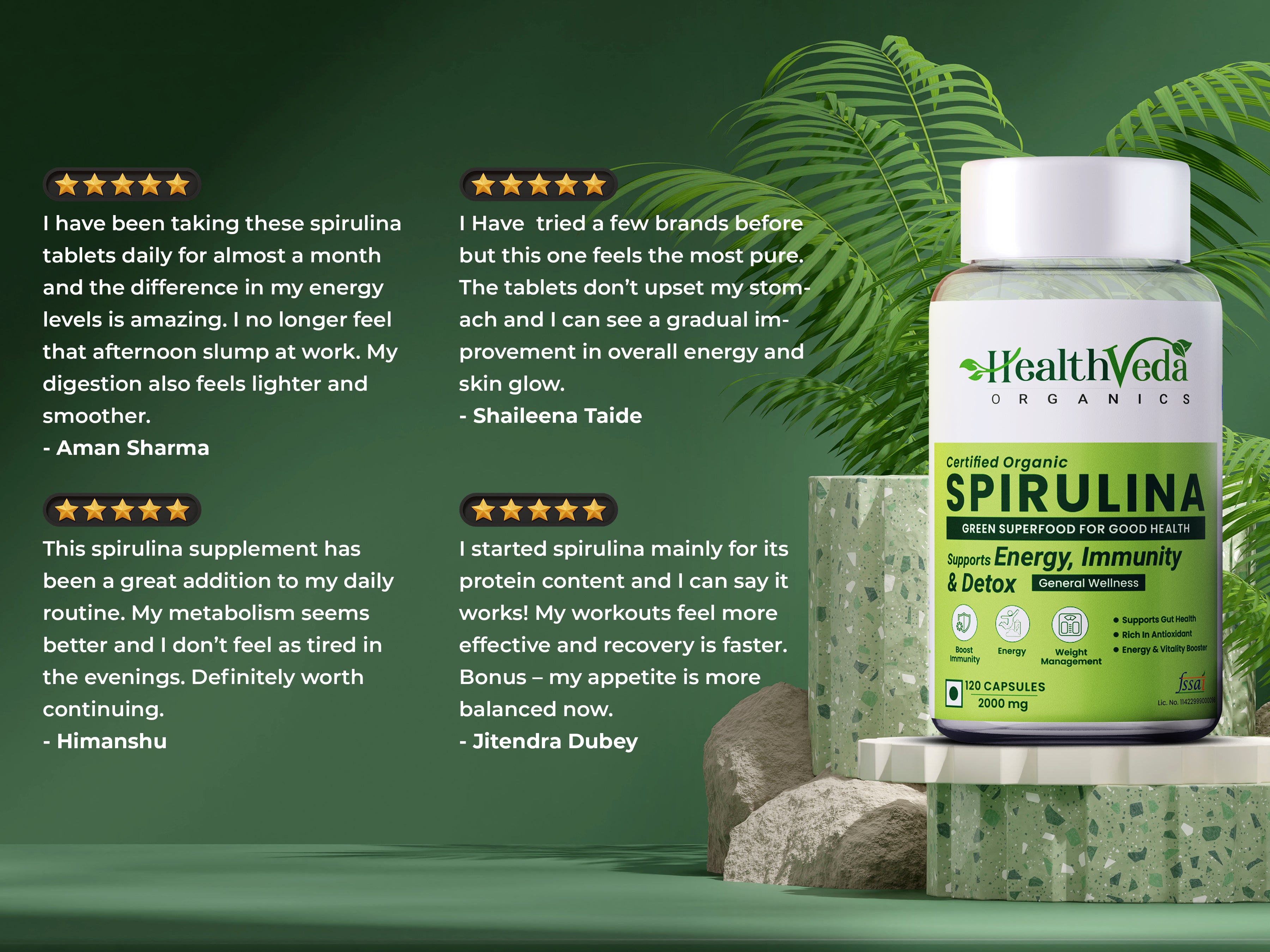 - SAFE & EFFECTIVE: HealthVeda Organics Spirulina Capsules are safe & effective to use without any side effects. 100% Pure, Natural and Health Friendly, and Organic.