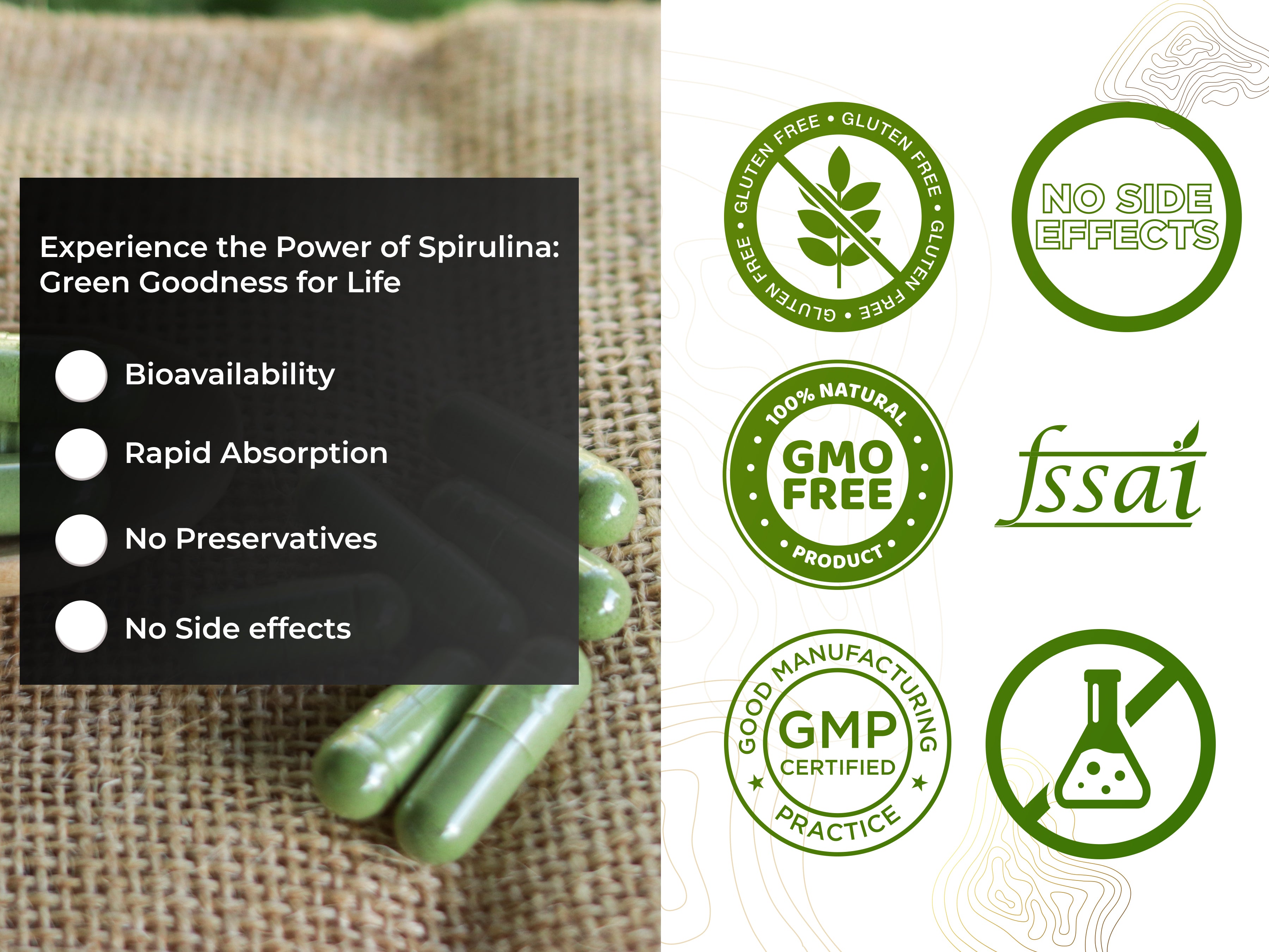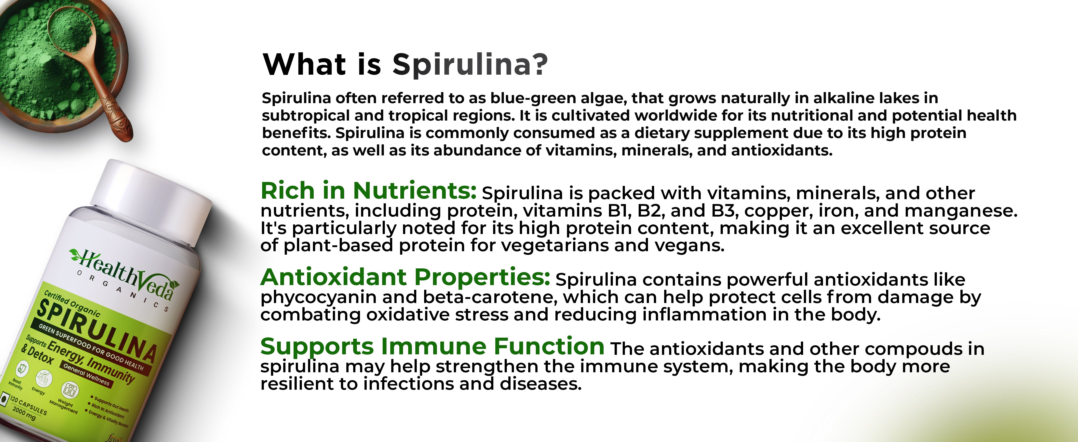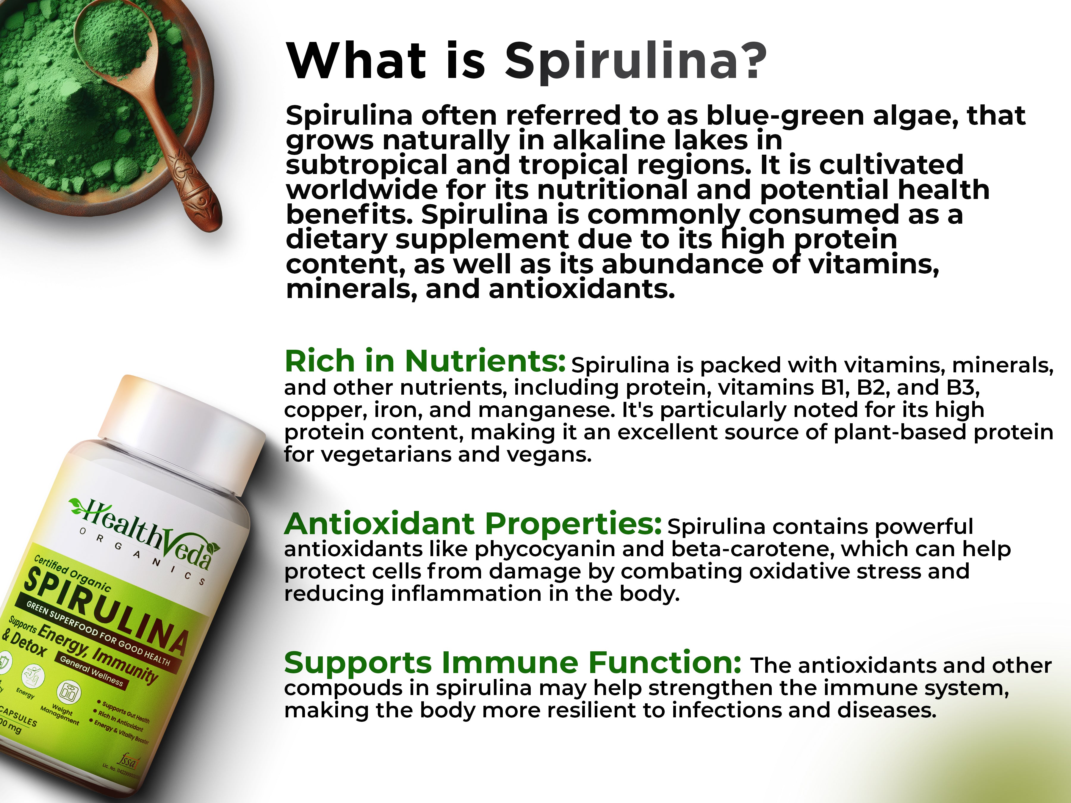 - SAFE & EFFECTIVE: HealthVeda Organics Spirulina Capsules are safe & effective to use without any side effects. 100% Pure, Natural and Health Friendly, and Organic.