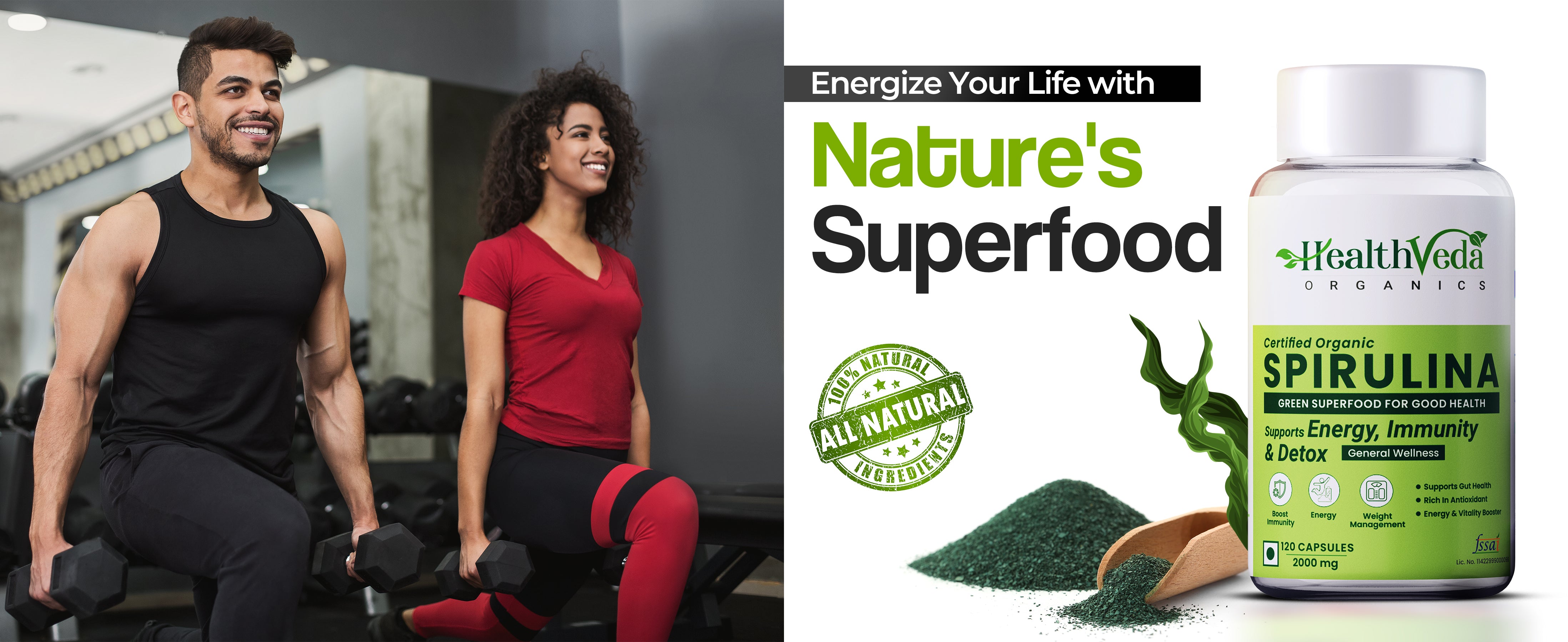 - GREEN FOOD FOR GREEN HEALTH: HealthVeda Organics Spirulina Capsules are a green superfood for green health. Spirulina promotes overall well-being as it regulates blood sugar & cholesterol levels, boosts energy levels, and strengthens muscle health & weight management.