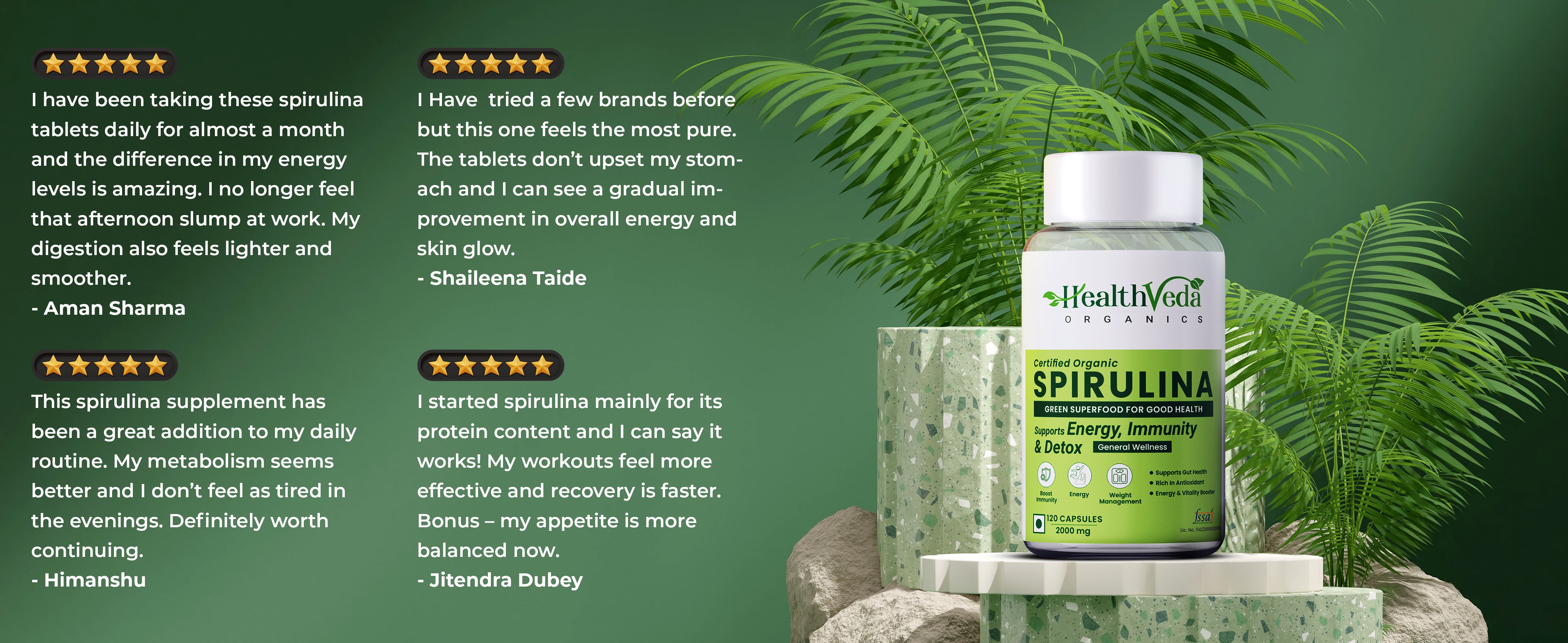 - WEIGHT MANAGEMENT: Health Veda Organics Spirulina Capsules promote optimal weight management as Spirulina fastens the process of breaking carbs into energy and boosts the calorie burn process.